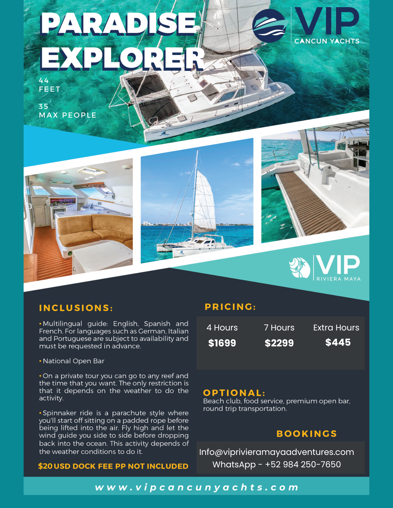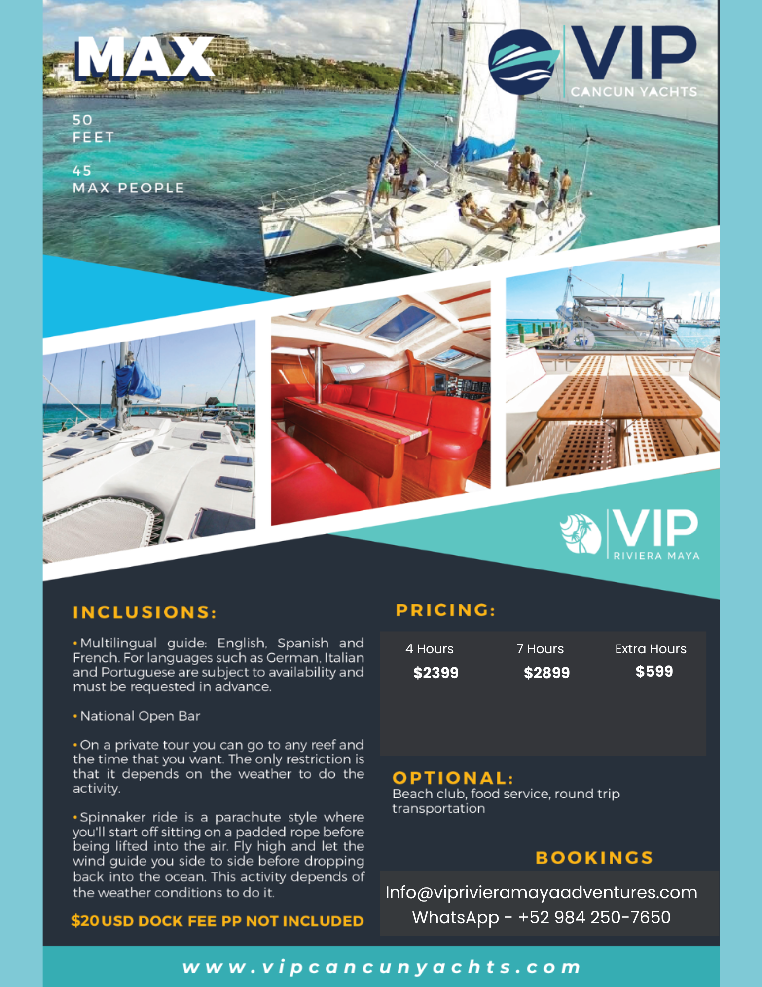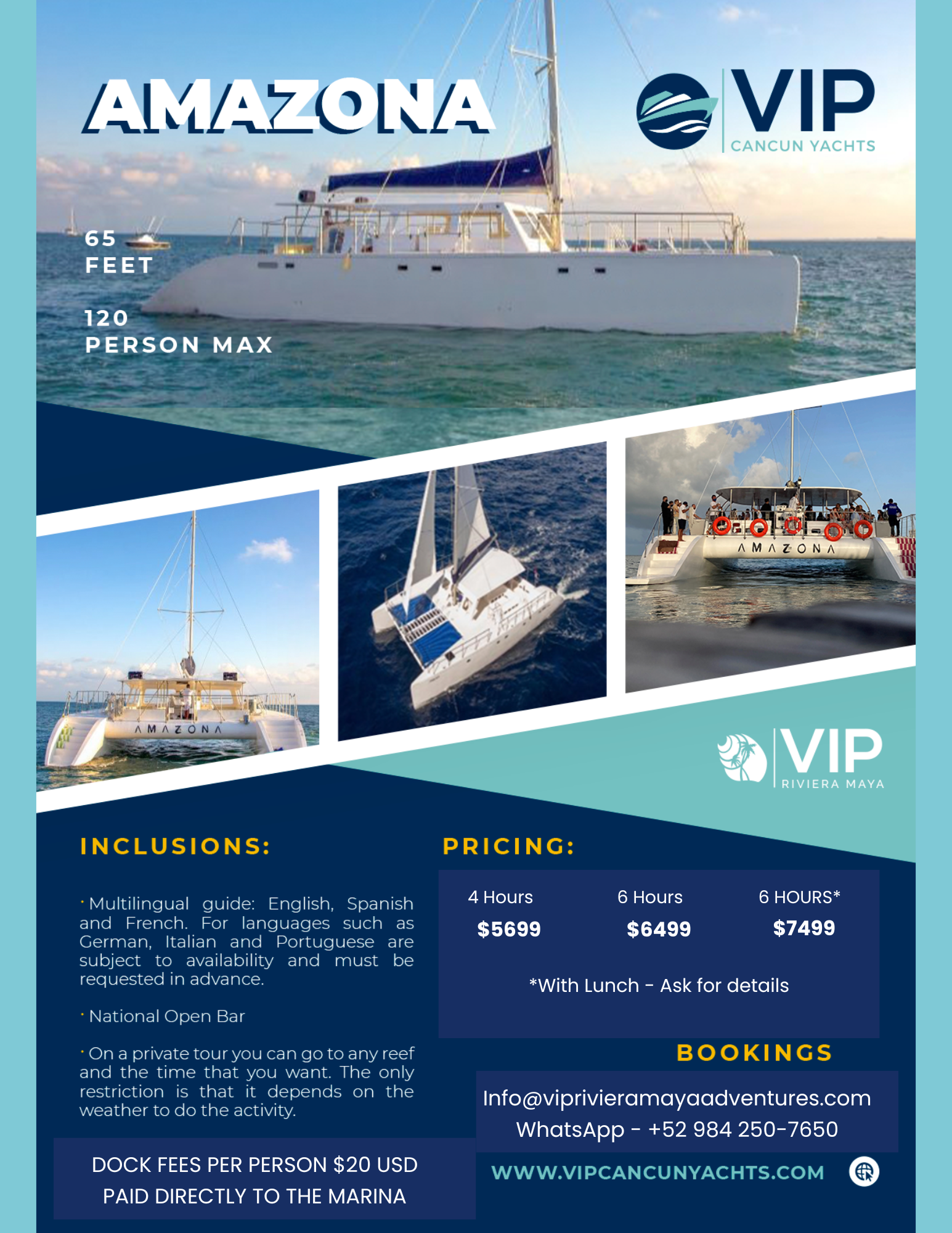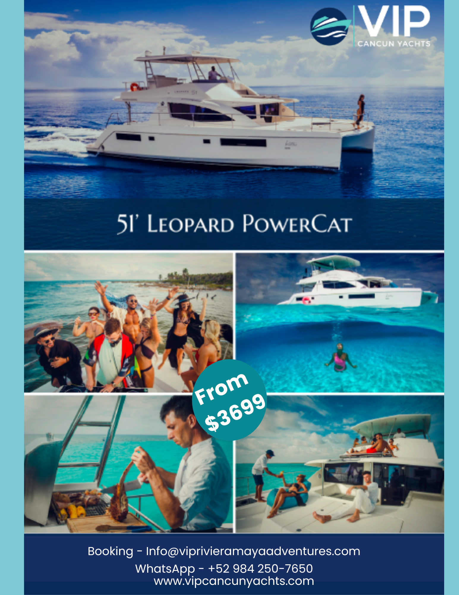 VIP Cancun Yachts operates out of Cancun, Puerto Aventuras, Maroma, and Playa del Carmen and is a sister company of VIP Riviera Maya and VIP Cancun Transportation. VIP Riviera Maya is a travel company that takes vacation tours and excursions to an entirely new level. We’re safe and reliable, but what we do best is customer service! Plus, we customize your tour to just what your group wants. We know that vacation time is valuable and there’s no time to waste. And our VIP Cancun Transportation offers safe, reliable, and comfortable airport transfers and other excursions with top-notch customer service, fully insured vehicles and the friendliest bi-lingual drivers with added service options when the need to customize your transportation is necessary.