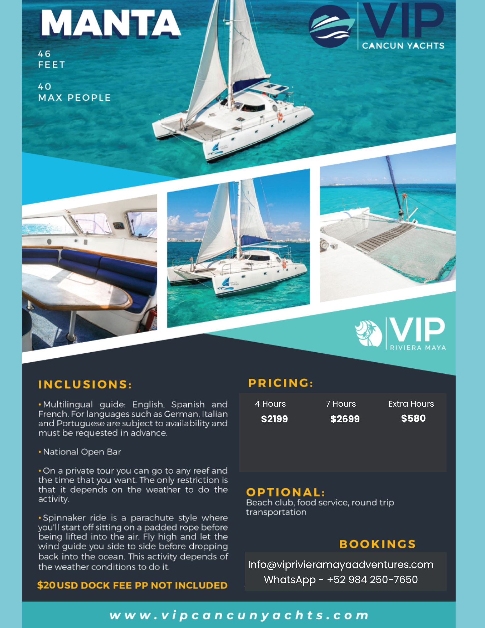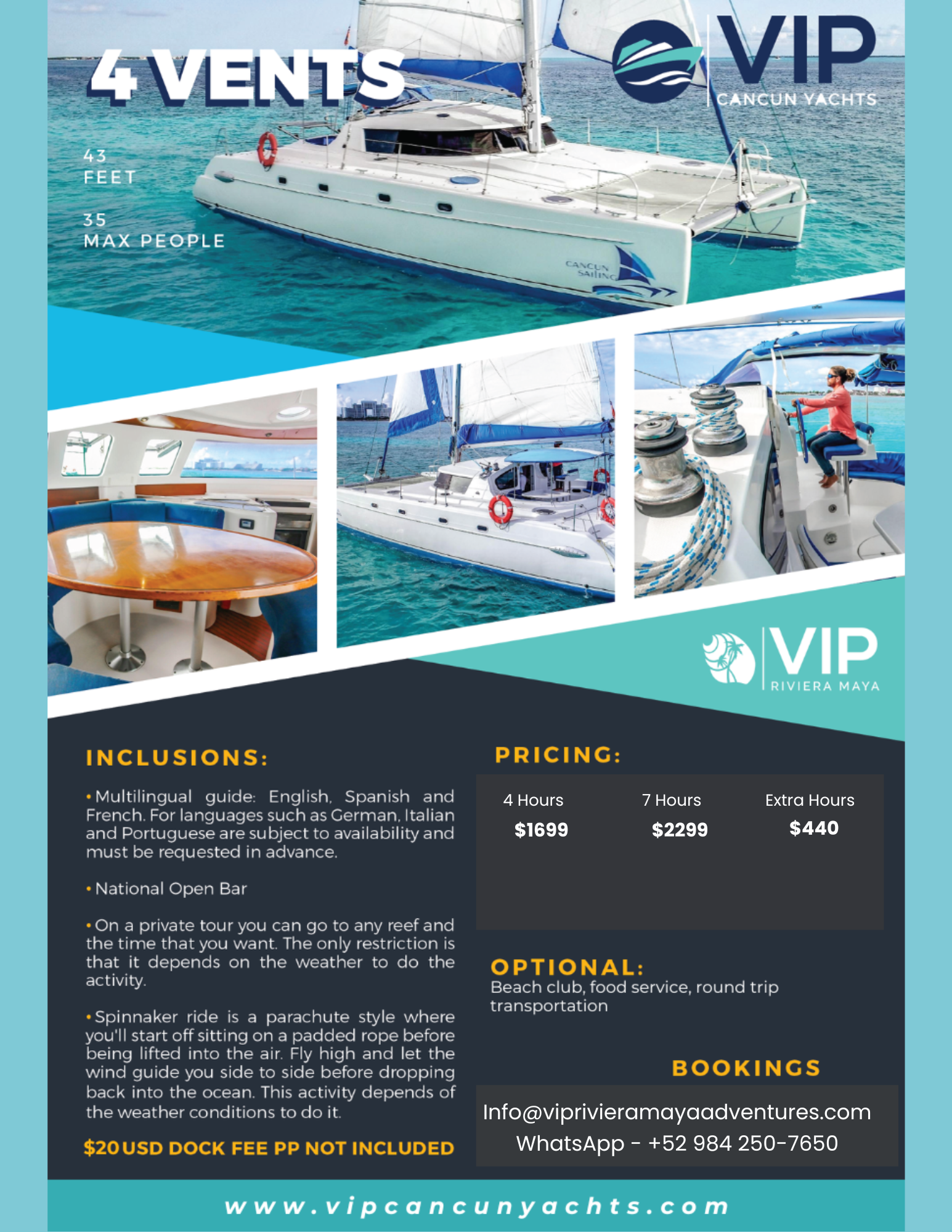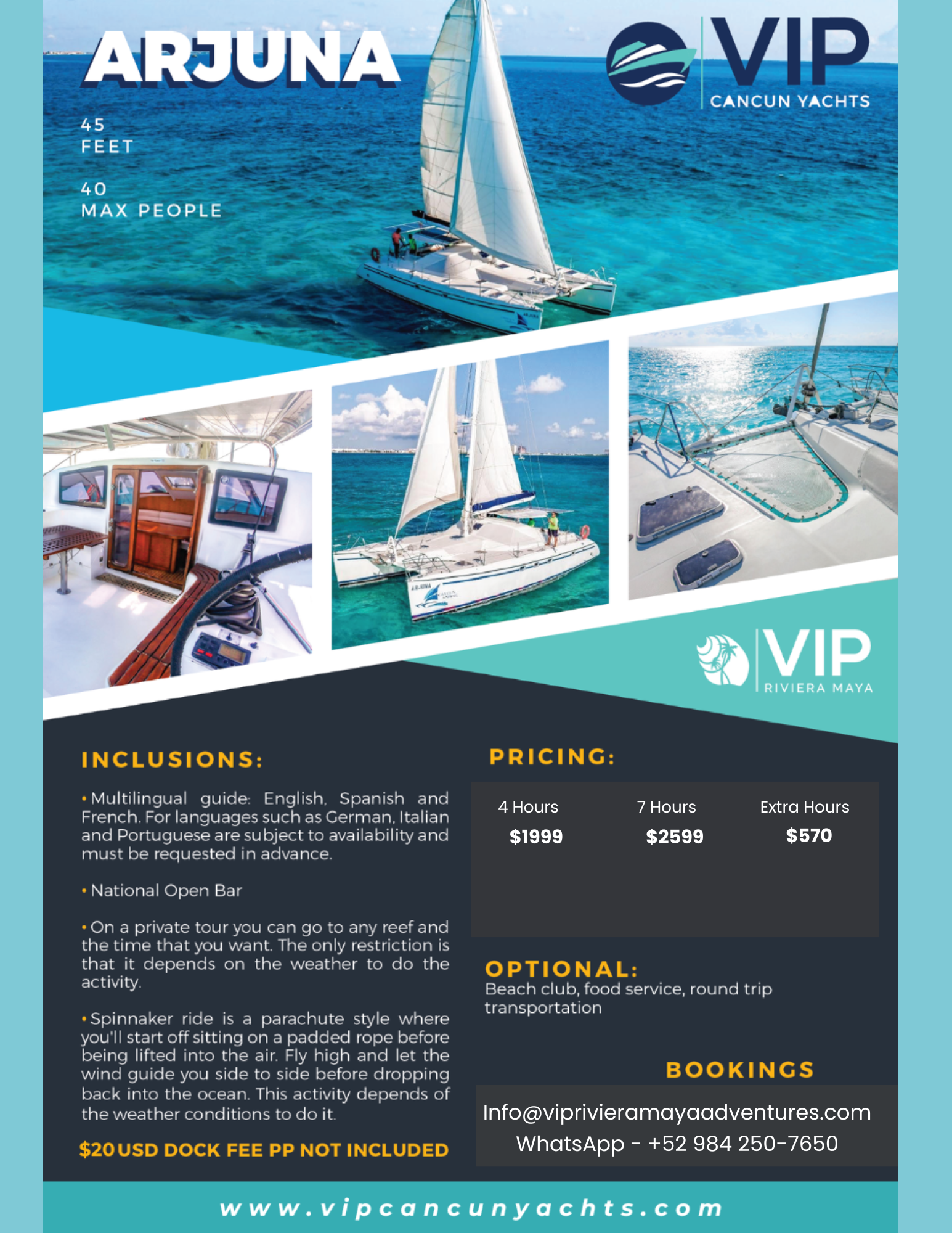 VIP Cancun Yachts operates out of Cancun, Puerto Aventuras, Maroma, and Playa del Carmen and is a sister company of VIP Riviera Maya and VIP Cancun Transportation. VIP Riviera Maya is a travel company that takes vacation tours and excursions to an entirely new level. We’re safe and reliable, but what we do best is customer service! Plus, we customize your tour to just what your group wants. We know that vacation time is valuable and there’s no time to waste. And our VIP Cancun Transportation offers safe, reliable, and comfortable airport transfers and other excursions with top-notch customer service, fully insured vehicles and the friendliest bi-lingual drivers with added service options when the need to customize your transportation is necessary.